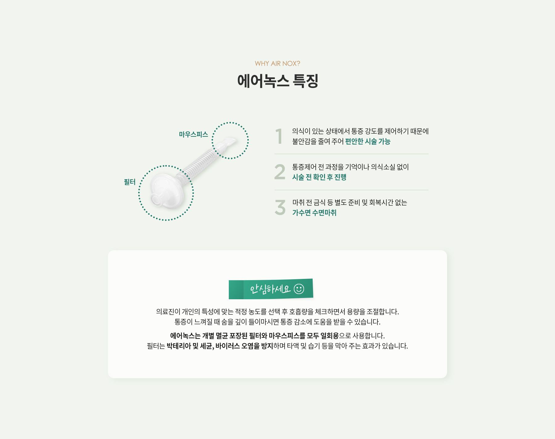 산소(O2)와 혼합하여 안전성을 높여 분만센터, 치과에서 수 십 년전부터 사용된 안전한 시스템이며